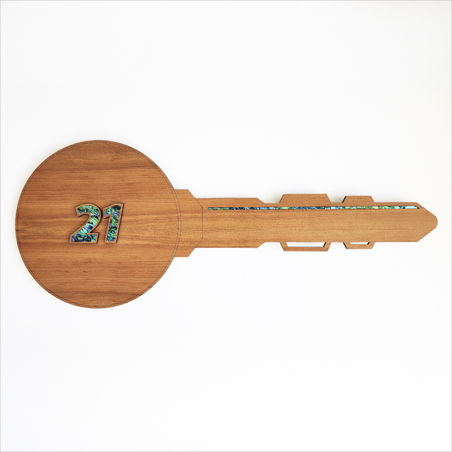 Hand made here in New Zealand, this beautiful 21st key is a modern twist on the old classic. Instead of glass or mirror, this key is made using bamboo and rimu veneer, and is finished off with touches of Paua giving it a truly kiwi vibe.