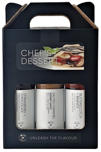 A mouthwatering selection of three delicious dessert sauces, boxed up to make an indulgent gift.