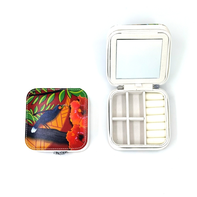 The art decorating this lovely jewellery box was created here in New Zealand by artist, Lucia Laubscher. It features our very distinct huia bird.