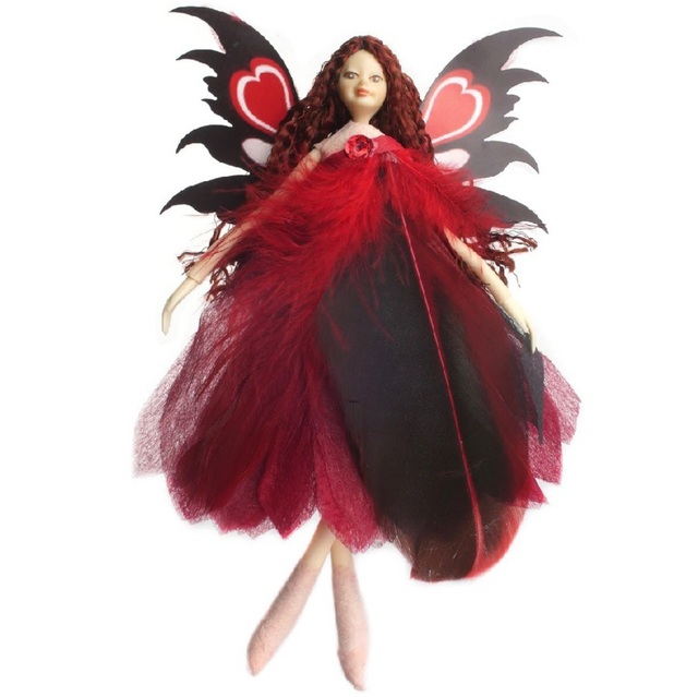 The Aroha fairy wears a dress made from dyed feathers, and has whimsical wings with hearts on them, reflecting her name, Aroha (Love).